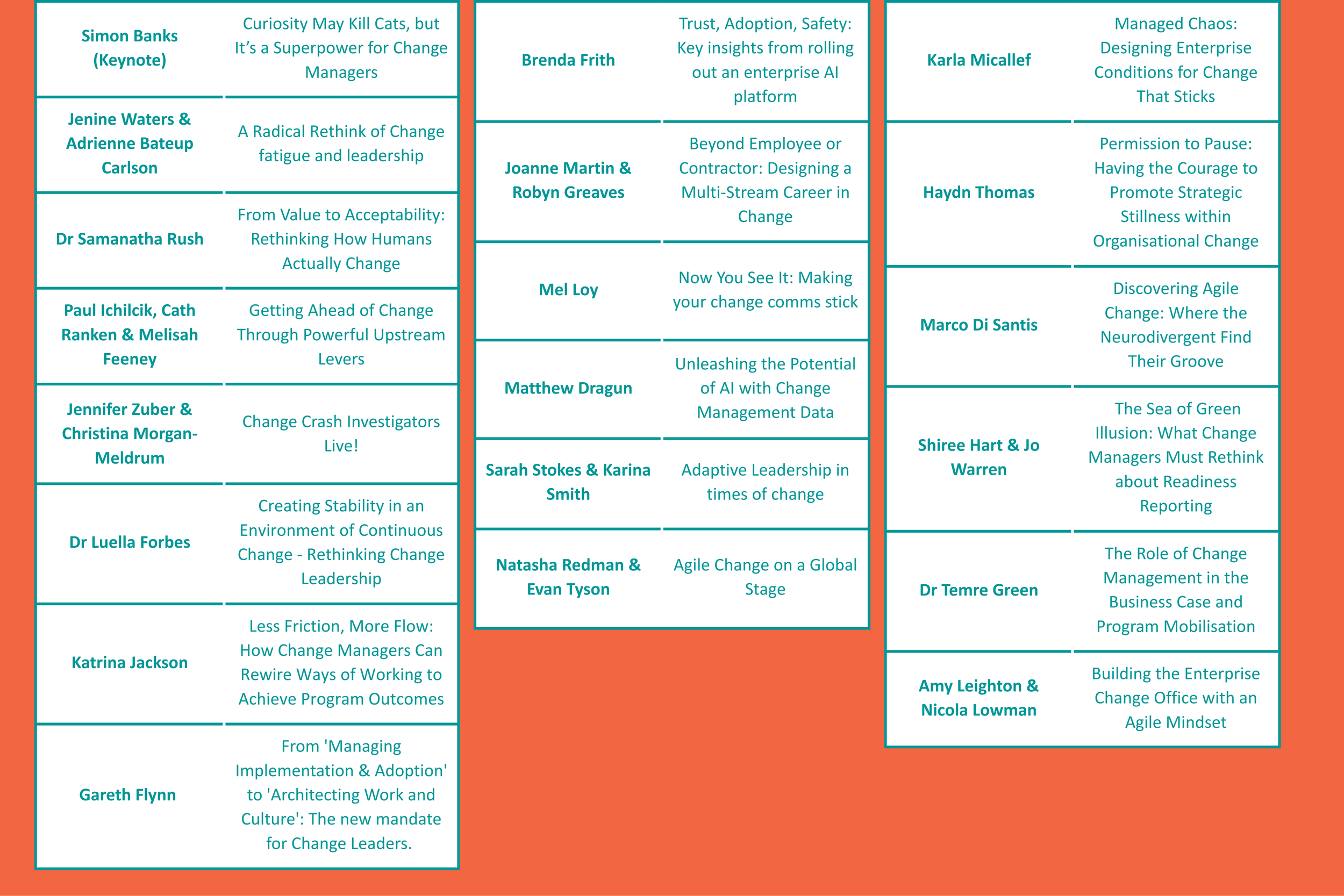 Participants will gain practical insights into our Minimum Viable Change Process (MVCP) and walk away with proven, adaptable approaches they can apply immediately in their own change environments.